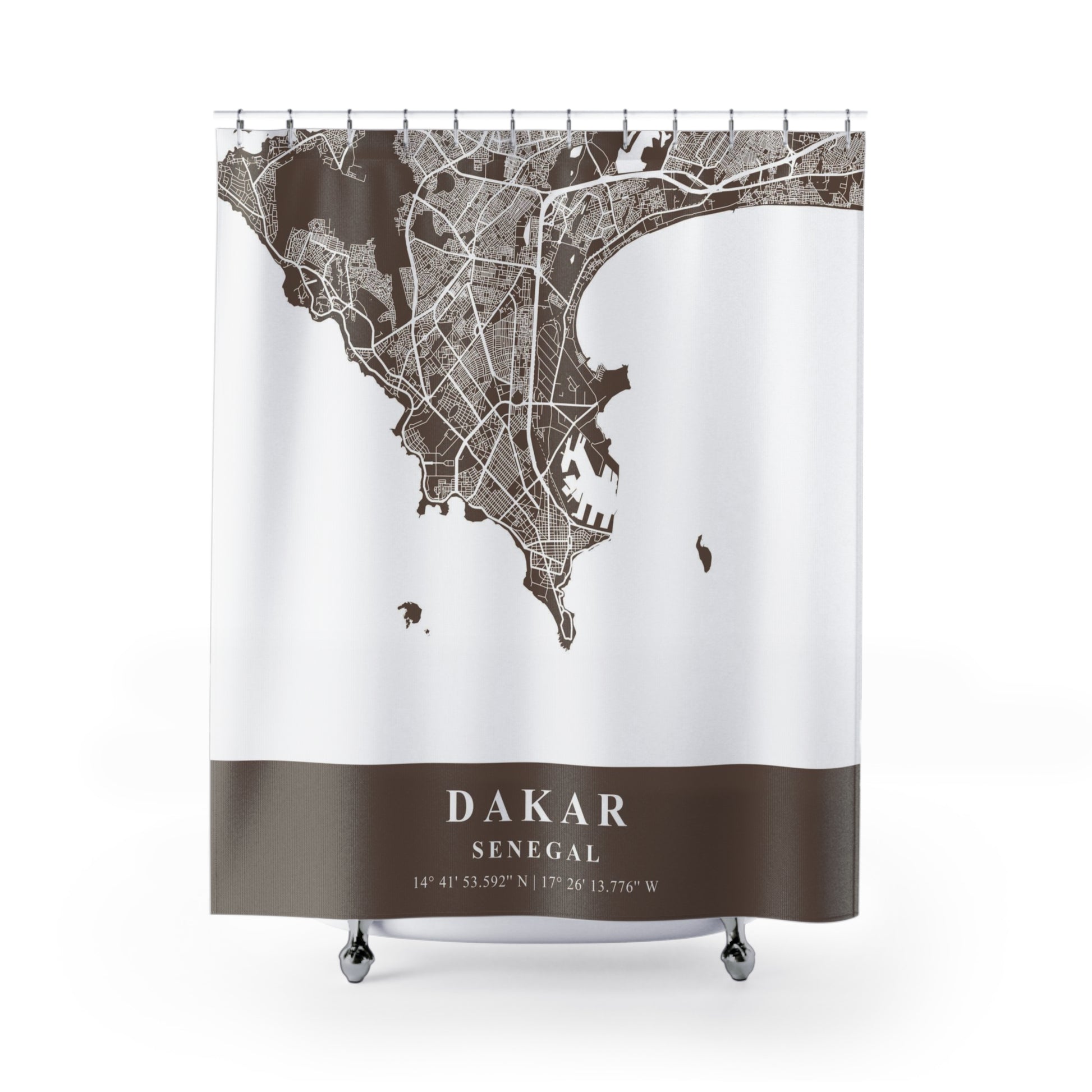 Introducing a minimalist shower curtain designed to infuse a unique and personal style into your bathroom. Crafted from exceptionally durable polyester, this curtain remains in pristine condition for an extended period. This City Map Print is an ideal canvas to display as a friendly reminder of your connection/memories, past or future visit or a celebration of your love for Dakar, Senegal.
