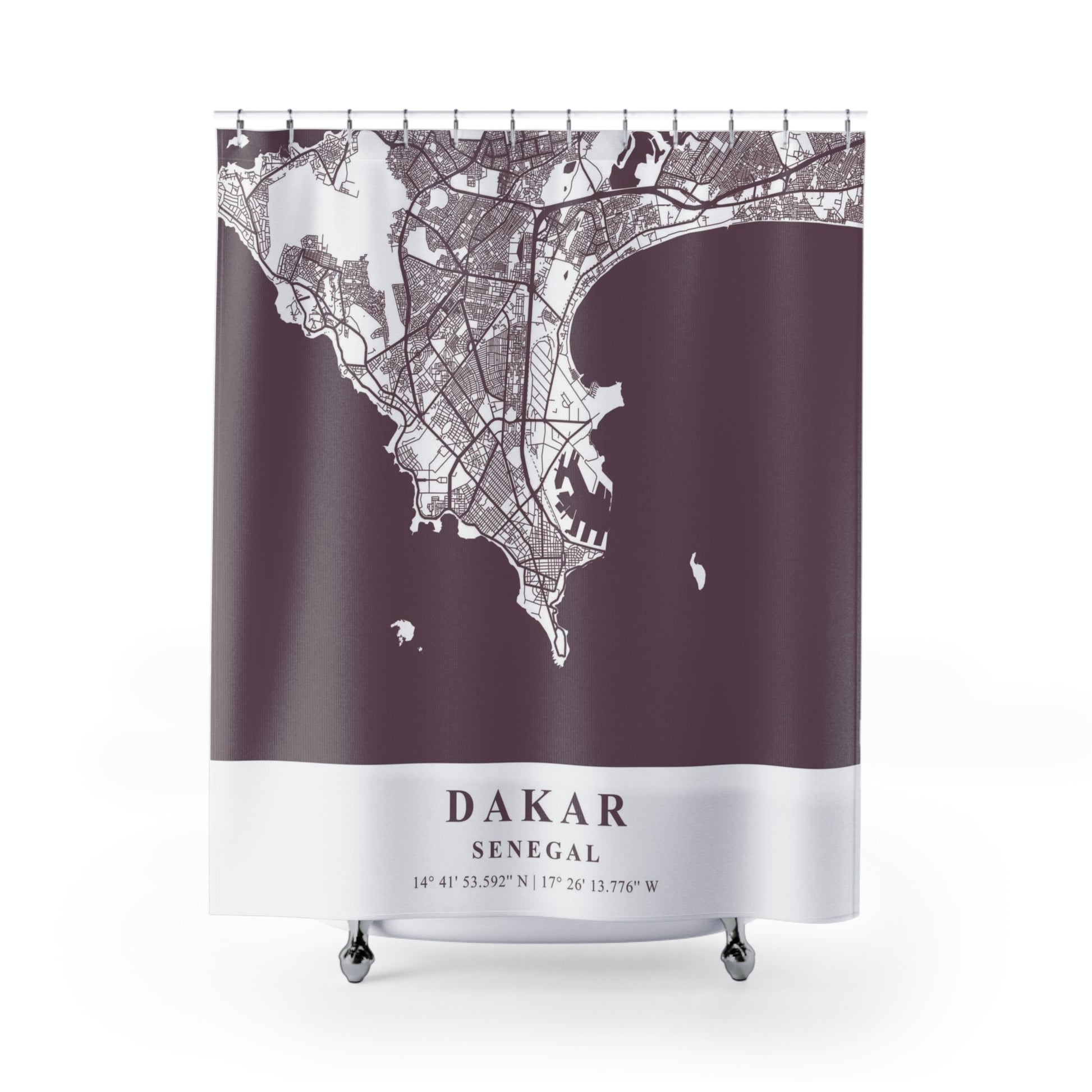 Introducing a minimalist shower curtain designed to infuse a unique and personal style into your bathroom. Crafted from exceptionally durable polyester, this curtain remains in pristine condition for an extended period. This City Map Print is an ideal canvas to display as a friendly reminder of your connection/memories, past or future visit or a celebration of your love for Dakar, Senegal. NOTE: It's important to note that while polyester offers good water resistance, adding a liner is advisable but not mandatory. This recommendation aims to safeguard and prolong the design on the shower curtain. Features: Material: 100% Polyester | Single-sided print | Hooks not included