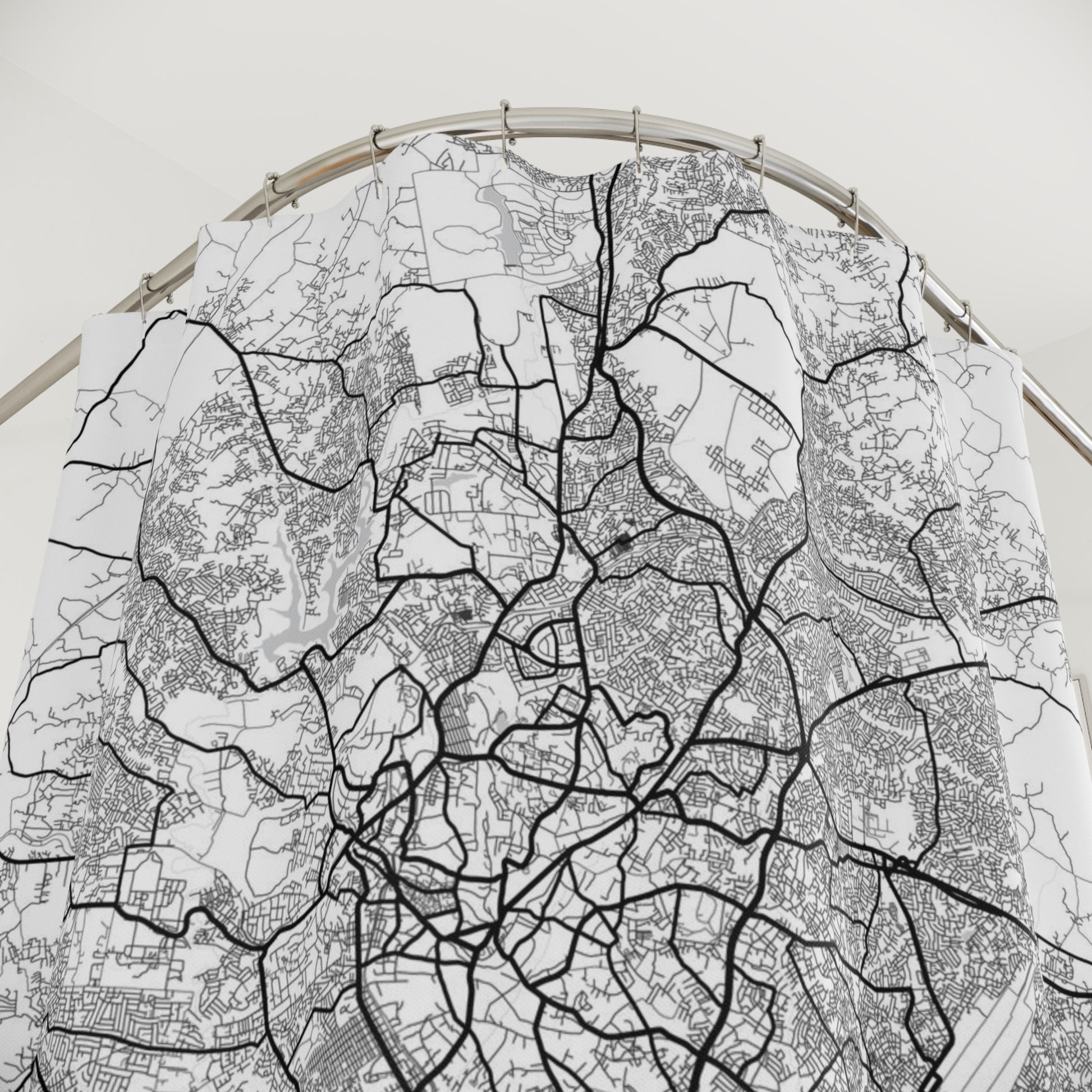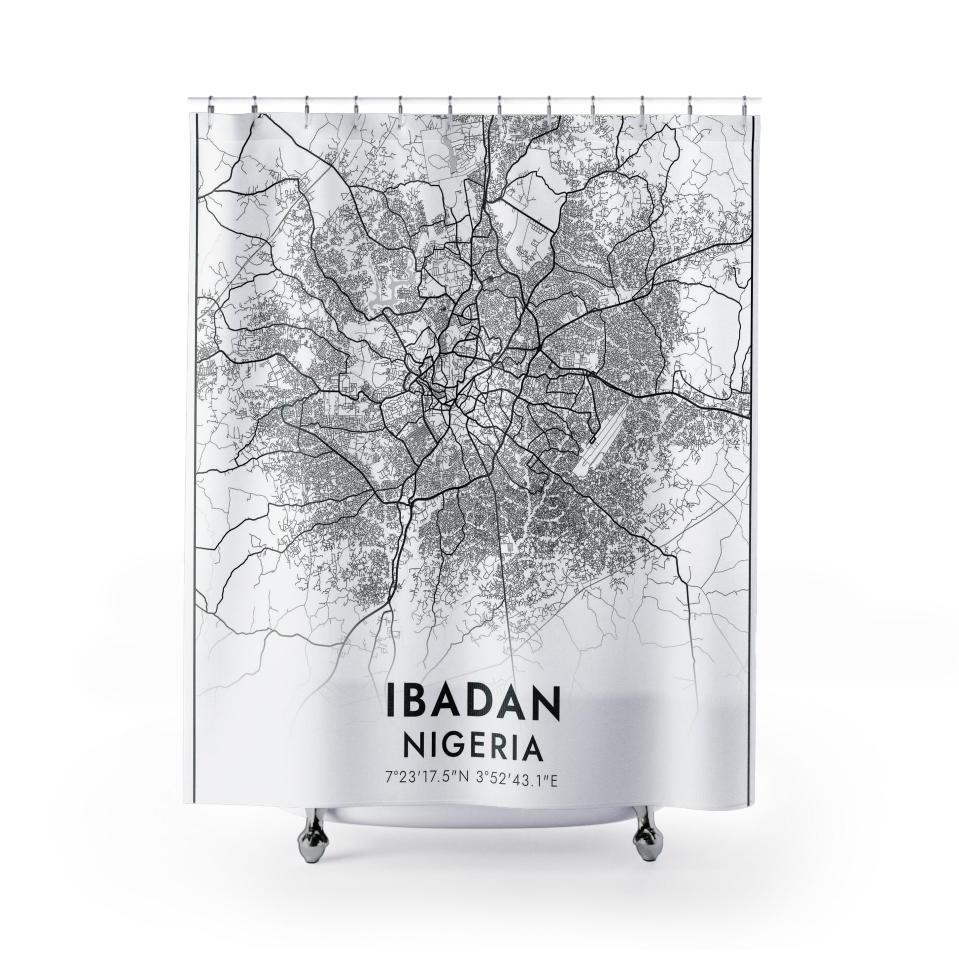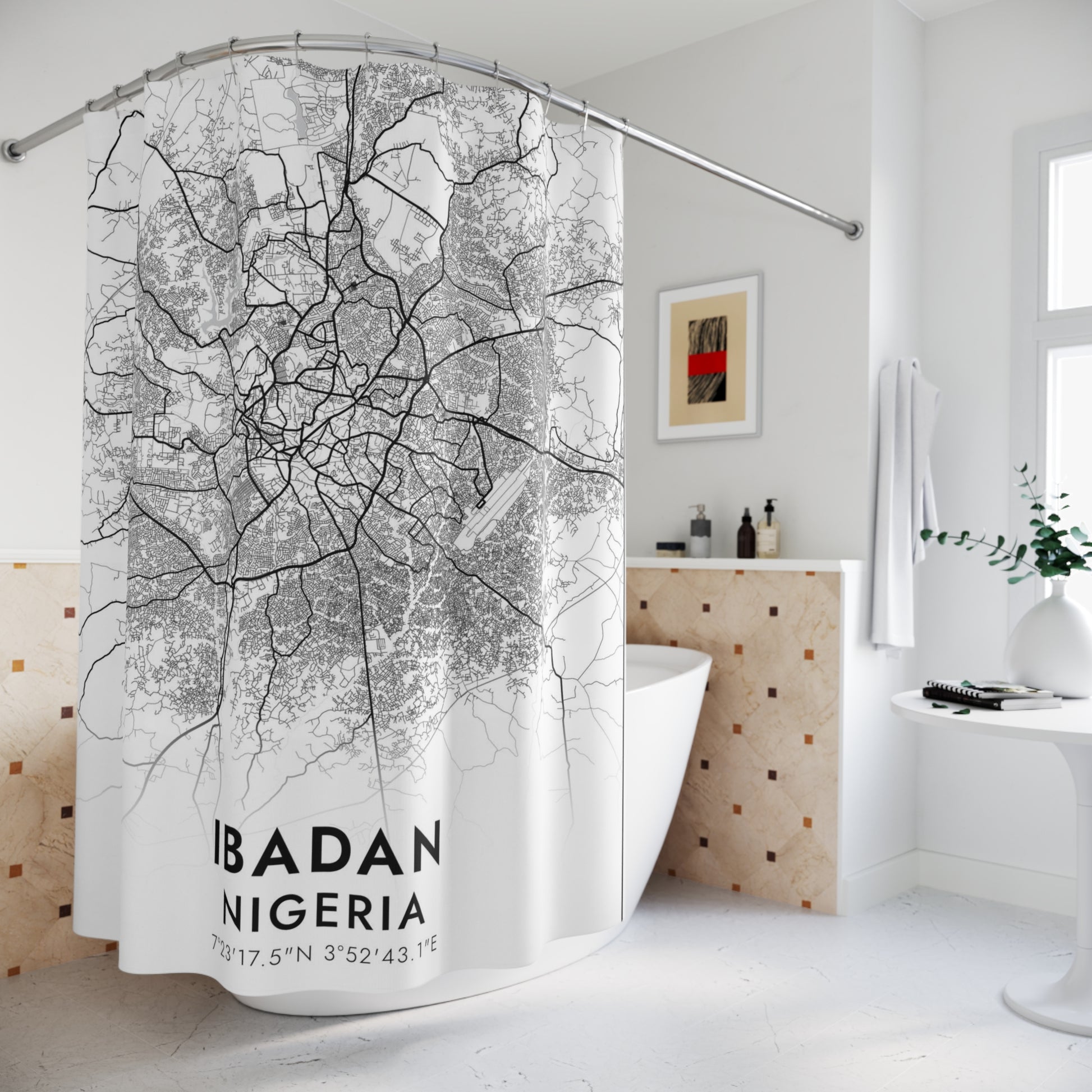 Introducing a minimalist shower curtain designed to infuse a unique and personal style into your bathroom. Crafted from exceptionally durable polyester, this curtain remains in pristine condition for an extended period. This City Map Print is an ideal canvas to display as a friendly reminder of your connection/memories, past or future visit or a celebration of your love for Ibadan, Nigeria. NOTE: It's important to note that while polyester offers good water resistance, adding a liner is advisable but not mandatory. This recommendation aims to safeguard and prolong the design on the shower curtain. Features: Material: 100% Polyester | Single-sided print | Hooks not included