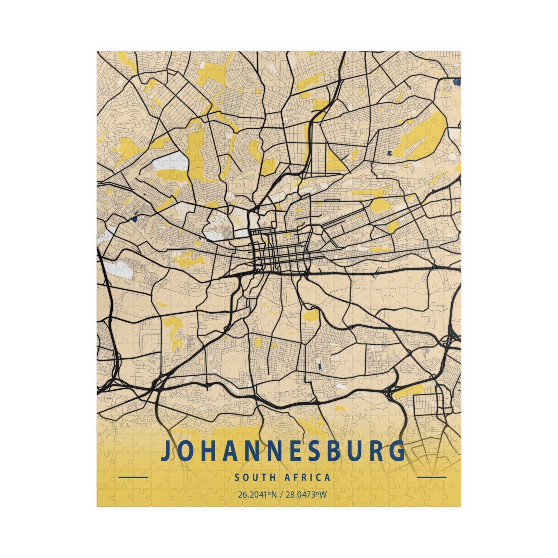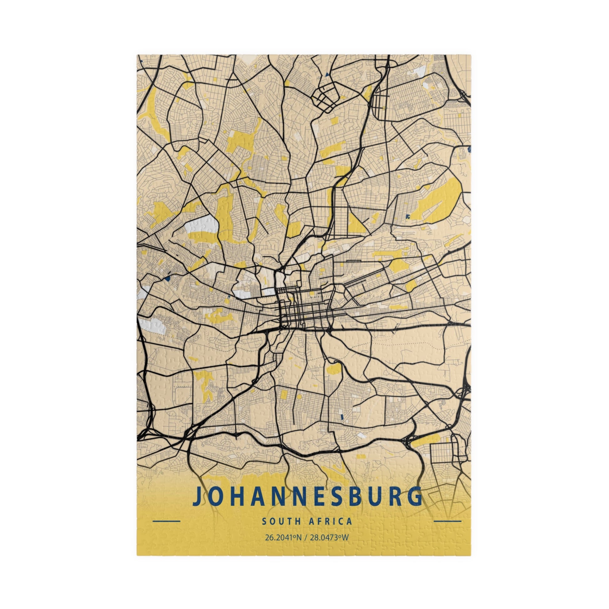 This puzzle is a minimalist City Map Aerial view of Johannesburg, South Africa. Relax and immerse yourself in this problem-solving activity. Working on a puzzle may improve critical thinking, mindfulness, focus and creativity. The puzzle features a glossy finish and a vertical orientation with each puzzle pack including a reference print for easy assembly.